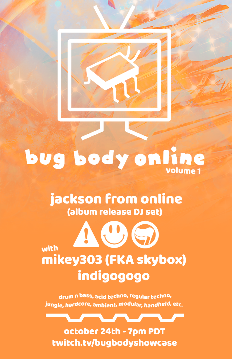 Bug Body Online and bug body presents are online and in person live shows, streams, and parties held by the label. keep updated on our socials for the newest event ANNOUNCEMENTS.